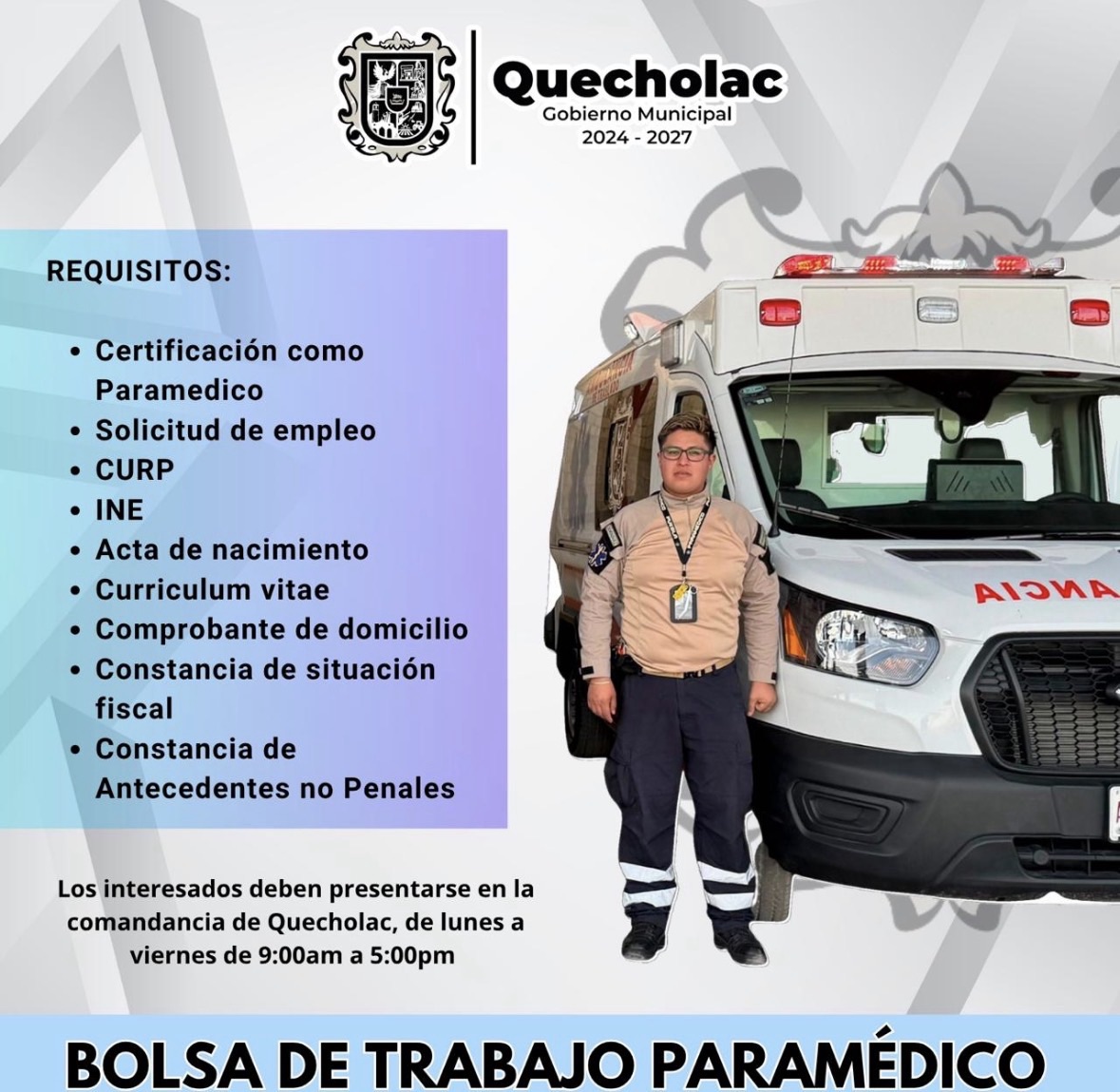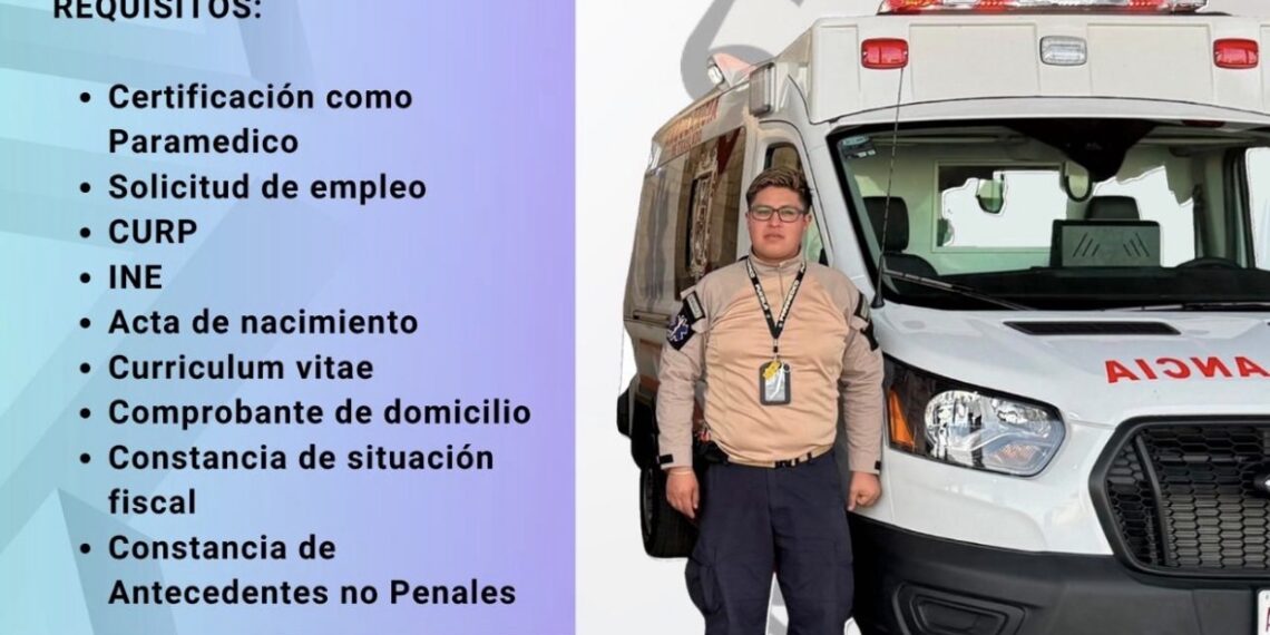 De acuerdo con la información oficial, las y los interesados deberán contar con certificación como paramédico, además de presentar documentación básica como solicitud de empleo, CURP, identificación oficial vigente, acta de nacimiento, currículum vitae, comprobante de domicilio y constancia de situación fiscal.
