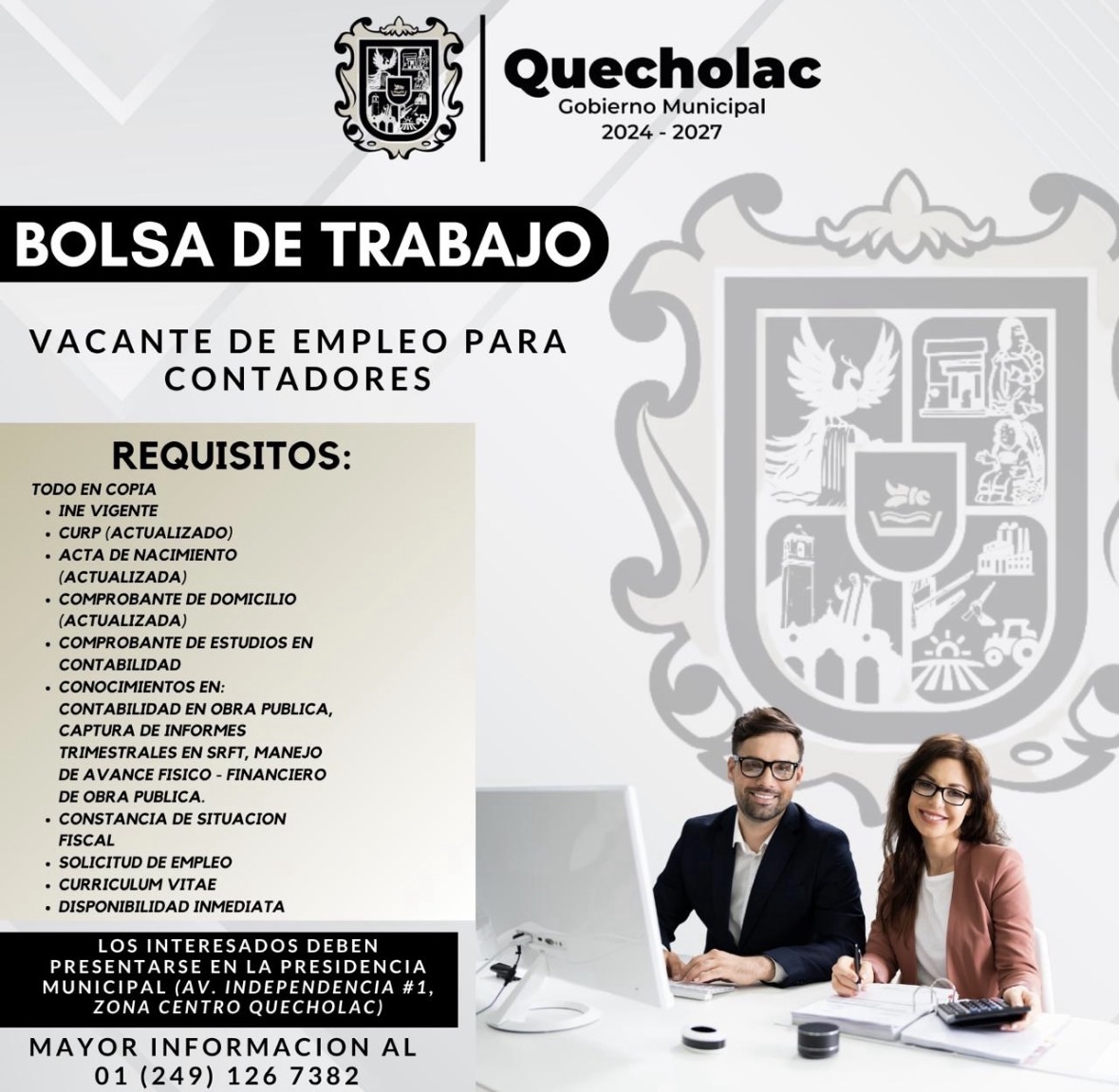 QUECHOLAC, PUE. – El Ayuntamiento de Quecholac, encabezado por la presidenta municipal María Guadalupe Martínez Gerardo, informó sobre la apertura de una vacante laboral dirigida a profesionistas en el área de contabilidad.