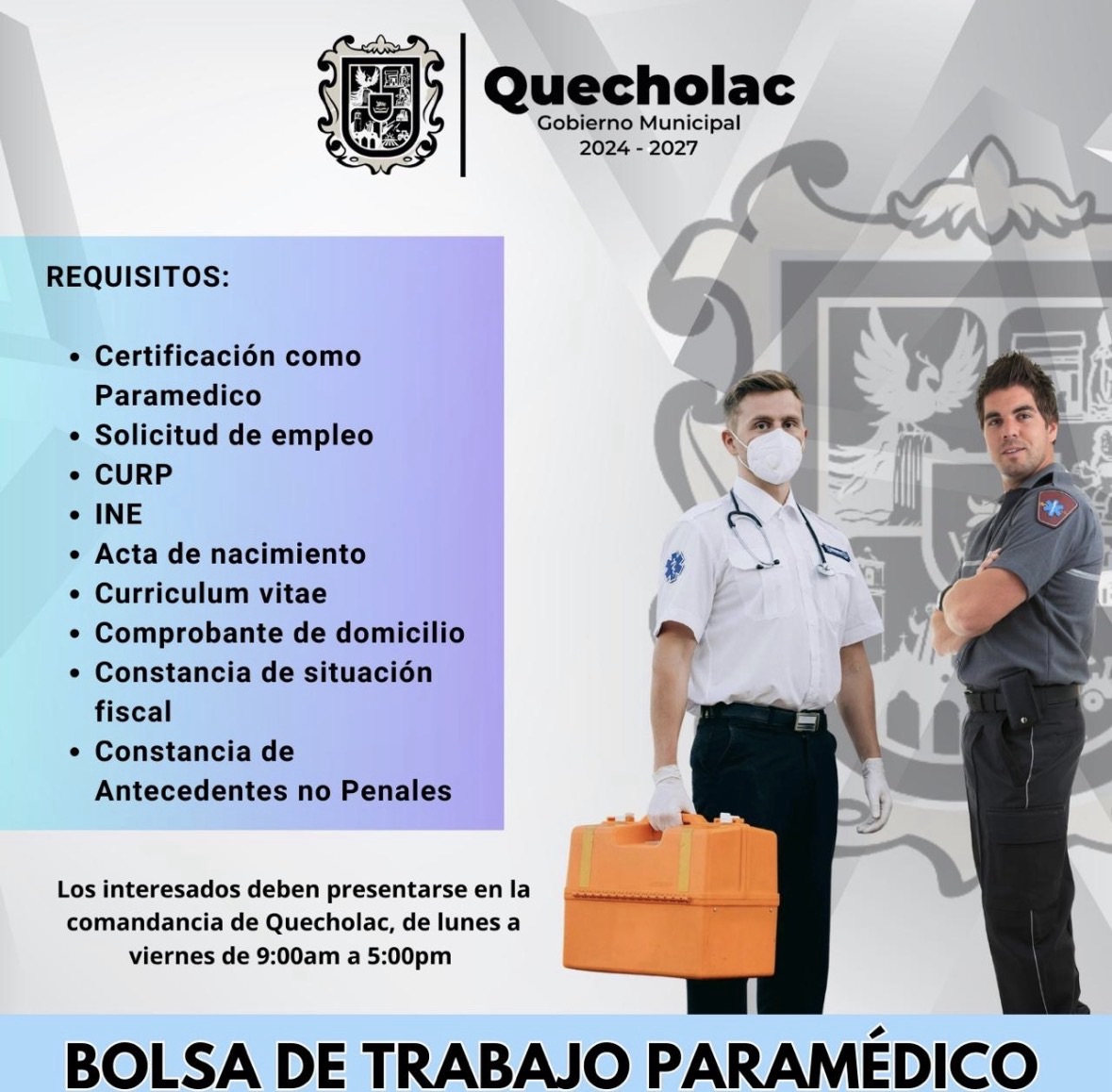 Quecholac, Pue. — El Ayuntamiento de Quecholac, encabezado por la presidenta municipal María Guadalupe Martínez Gerardo, anunció la apertura de una vacante para paramédicos con el objetivo de reforzar la atención prehospitalaria en la demarcación.