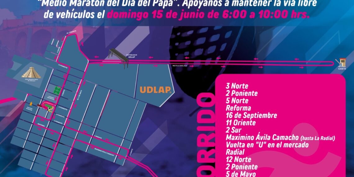 San Andrés Cholula, Puebla.- Con el objetivo de garantizar una movilidad segura para las y los participantes del Medio Maratón del Día del Padre, así como para la ciudadanía en general, el Ayuntamiento de San Andrés Cholula, a través de la Secretaría de Seguridad Pública y Protección Ciudadana (SSPPC), implementará un operativo especial de gestión vial.