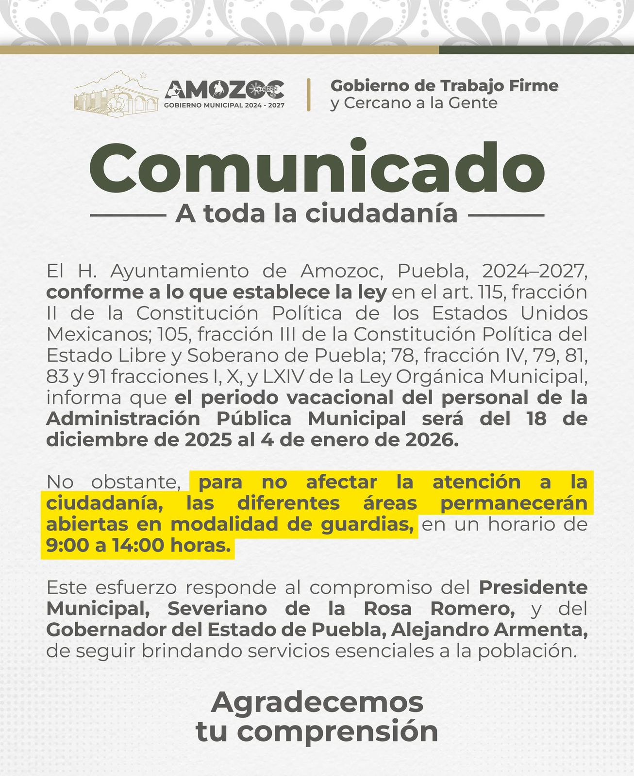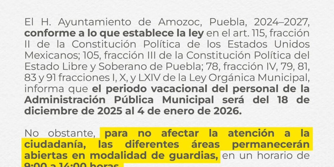 Amozoc de Mota, Puebla a 18 de diciembre de 2025.– El Gobierno Municipal 2024–2027, informa a la ciudadanía que el periodo vacacional del personal de la Administración Pública Municipal se llevará a cabo del 18 de diciembre de 2025 al 4 de enero de 2026, reanudándose las actividades administrativas de manera regular el lunes 5 de enero de 2026, esto conforme a lo aprobado en la Séptima Sesión Extraordinaria del Segundo Año de Gobierno y con fundamento en la normatividad vigente.