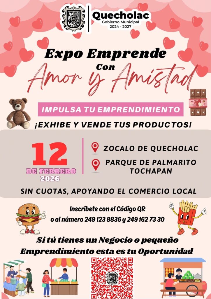 El Honorable Ayuntamiento de Quecholac invita a las y los emprendedores del municipio y sus comunidades a participar en la Expo Emprende con “Amor y Amistad”, un espacio diseñado para impulsar el comercio local y fortalecer la economía de pequeños negocios.