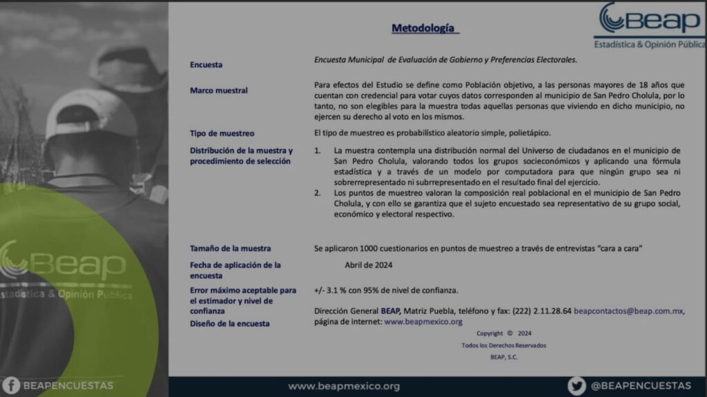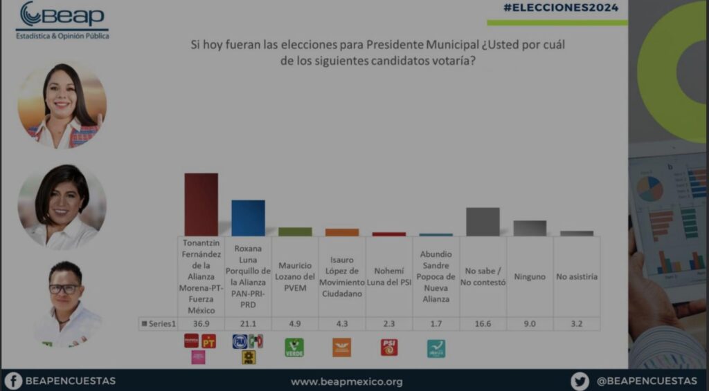 A través de 1000 encuestas aplicadas bajo la metodología «cara a cara» durante abril de 2024, con un margen de error del +/-3.5% y un nivel de confianza del 95%, BEAP detalla que Tonantzin Fernández tiene un novel de aceptación de 36.9%, sobre el 21.1% de Roxana Luna.