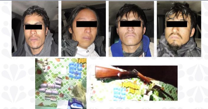 Al ejecutar la diligencia, fueron detenidos Héctor Omar N., Fabiola N., Gilberto N. y Paul N., en posesión de 21 envoltorios con dosis de la droga conocida como cristal, una báscula gramera digital y dinero en efectivo, así como una escopeta y 44 cartuchos útiles.