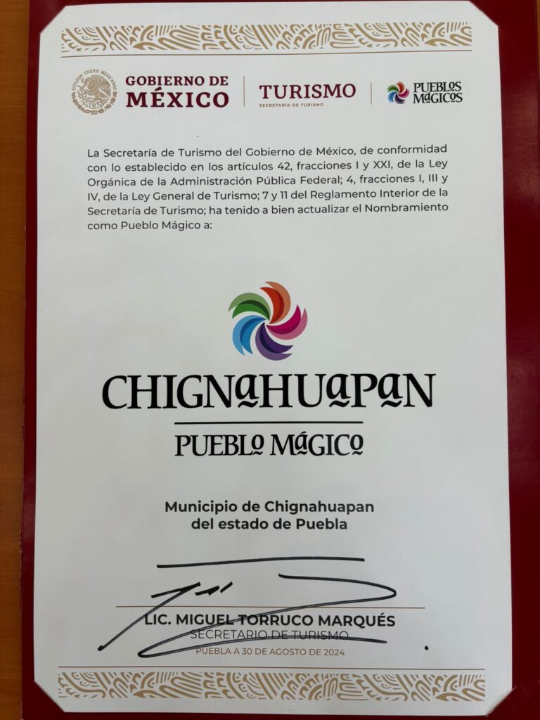 Reafirmando el compromiso con el desarrollo turístico y cultural este viernes 30 de agosto, Chignahuapan siguió de fiesta, ya que recibió por parte del Secretario de Turismo Federal, Miguel Torruco Marqués y de la Presidenta del Patronato del Sistema Estatal DIF, Gaby Bonilla, junto con la Secretaria de Turismo del Estado, Marta Ornelas; el refrendo como Pueblo Mágico, acción que posiciona a Chignahuapan como un gran destino turístico.