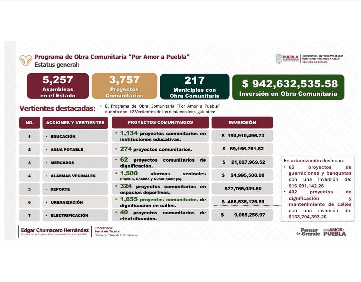 El coordinador del programa de Obra Comunitaria, Edgar Chumacero Hernández, informó que al momento suman 5 mil 257 asambleas en todo el estado donde se desarrollan 3 mil 757 proyectos prioritarios en cada uno de los 217 municipios, con una inversión de 942 millones 632 mil 535 pesos.