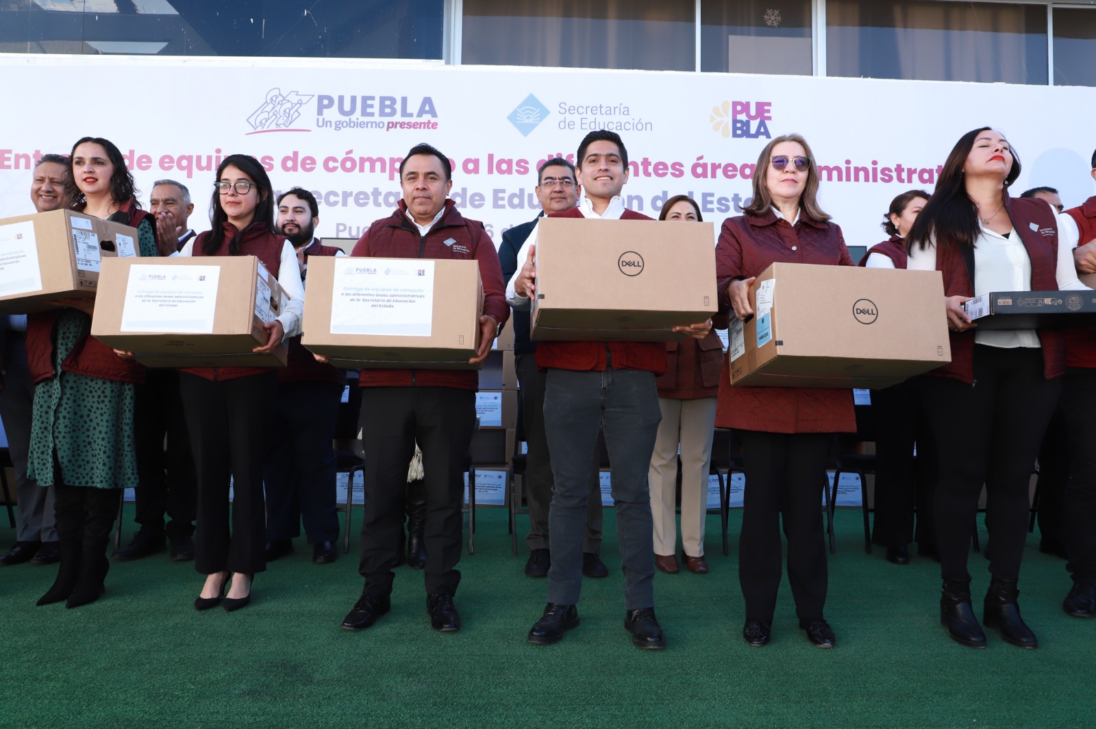 CIUDAD DE PUEBLA, Pue. – Como parte de la visión del gobierno estatal de impulsar la actualización y modernización de toda la administración pública, el titular del Ejecutivo, Sergio Salomón entregó mil 200 equipos de cómputo a las diferentes áreas administrativas de la Secretaría de Educación, las cuales forman parte de los 8 mil 391 que se estarán otorgando al servicio público.
