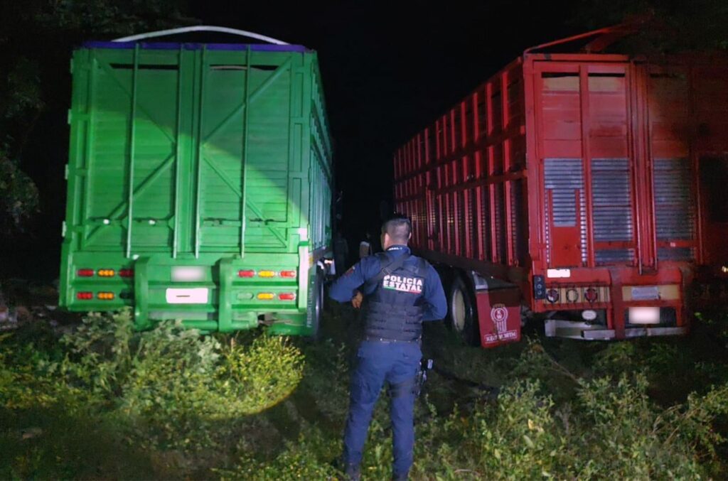 Los vehículos asegurados son: un tractocamion Freigthliner, de color verde con blanco y franjas amarillas, así como otro de la marca Kenworth, de color rojo.