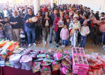Posteriormente, en la Plaza de la Concordia, se llevó a cabo una entrega masiva de juguetes a niñas y niños de la Cabecera Municipal. Durante el evento, las y los asistentes disfrutaron de un espectáculo infantil, así como de la entrega gratuita de paletas de hielo, algodón de azúcar, pelotas y juguetes.