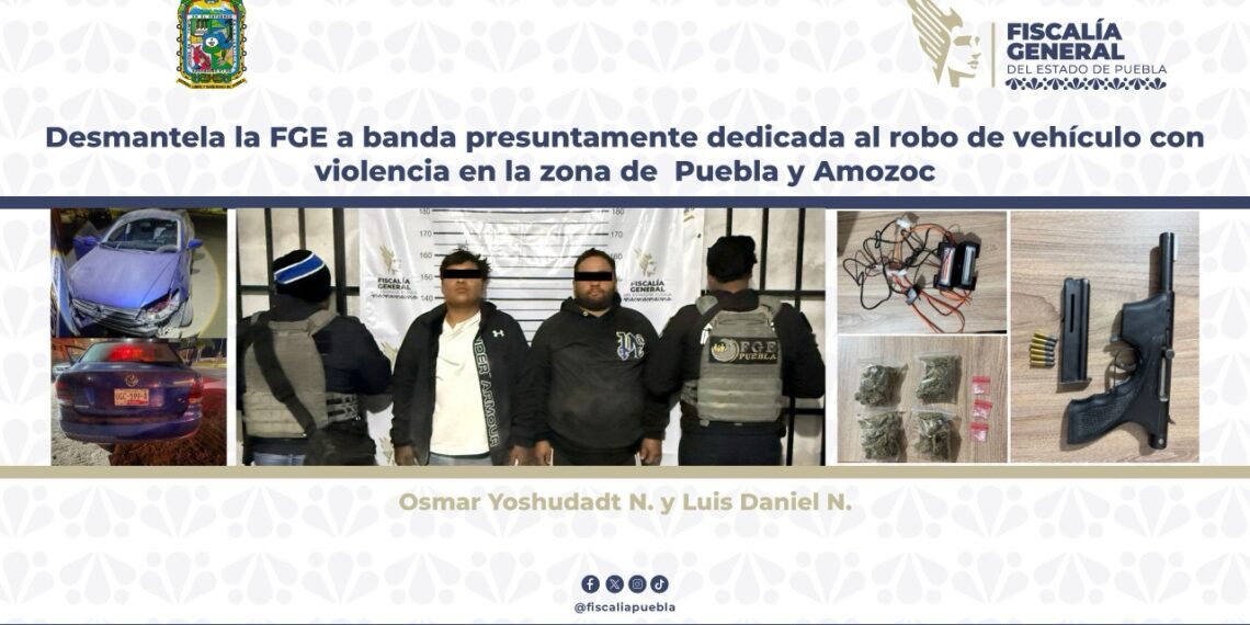 La Fiscalía General del Estado desarticuló mediante un operativo a banda delictiva presuntamente dedicada al robo de vehículo con violencia en la zona limítrofe de los municipios de Puebla y Amozoc, operación en la que fueron asegurados Osmar Yoshudadt N. y Luis Daniel N. como probables integrantes.