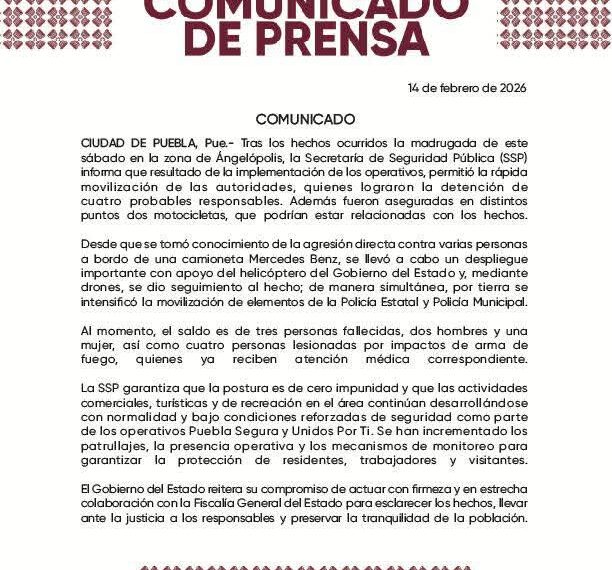 La Secretaría de Seguridad Pública informó la detención de cuatro personas presuntamente relacionadas con el ataque armado registrado afuera del bar Sala de Despecho, en la zona de Angelópolis.