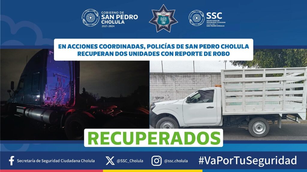San Pedro Cholula, Pue.– Elementos de la Secretaría de Seguridad Ciudadana (SSC Cholula) de San Pedro Cholula lograron la recuperación, mediante acciones coordinadas, de un tracto camión en San Juan Tlaula, y una camioneta Nissan, con reporte de robo en la ciudad de Puebla.