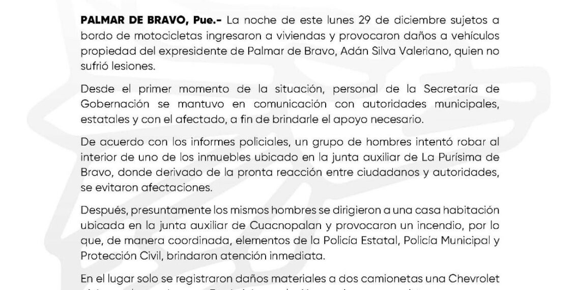PALMAR DE BRAVO, Pue.- La noche de este lunes 29 de diciembre sujetos a bordo de motocicletas ingresaron a viviendas y provocaron daños a vehículos propiedad del expresidente de Palmar de Bravo, Adán Silva Valeriano, quien no sufrió lesiones.