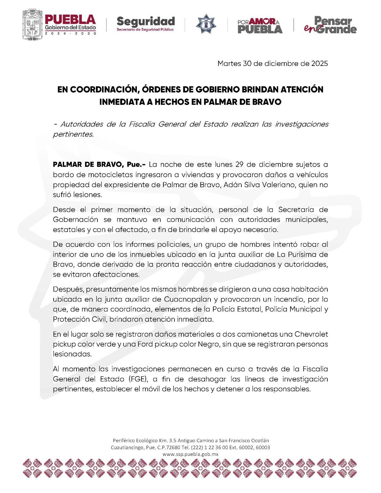 Se registraron ataques contra camionetas y un domicilio presuntamente vinculados al exalcalde de Palmar de Bravo, Adán Silva Valeriano, en...