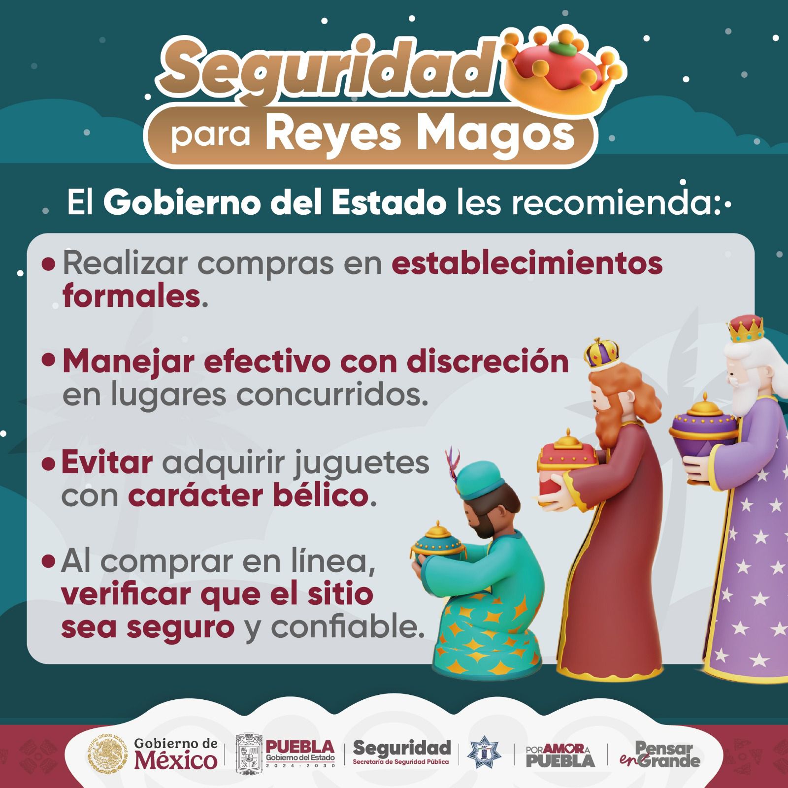 CIUDAD DE PUEBLA, Pue.- Para privilegiar la protección de las familias en torno al Día de Reyes, a través del Operativo Puebla Segura, la Secretaría de Seguridad Pública Estatal, Secretaría de Marina (SEMAR), Secretaría de la Defensa Nacional (DEFENSA), Guardia Nacional (GN), así como de distintas dependencias estatales y corporaciones municipales, mantienen el despliegue de más de 3 mil 500 elementos que realizan patrullajes de día y noche, tanto por aire con el uso de los helicópteros, como pie-tierra.