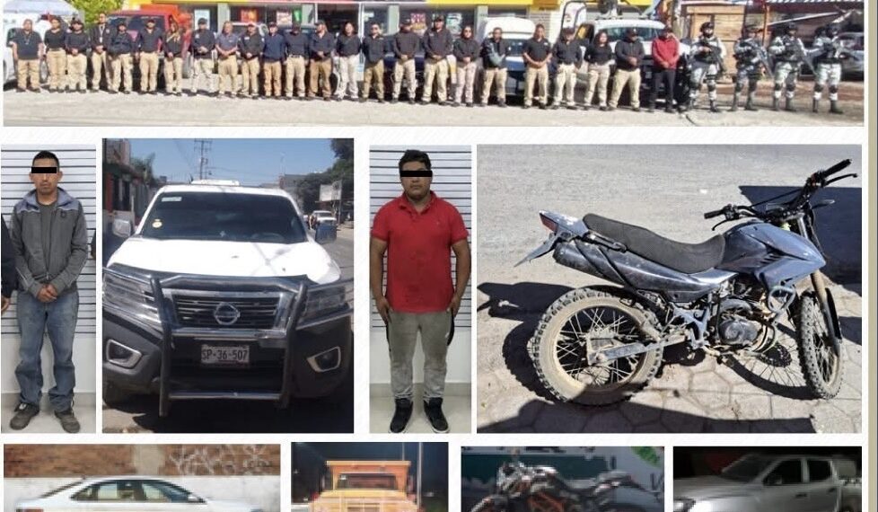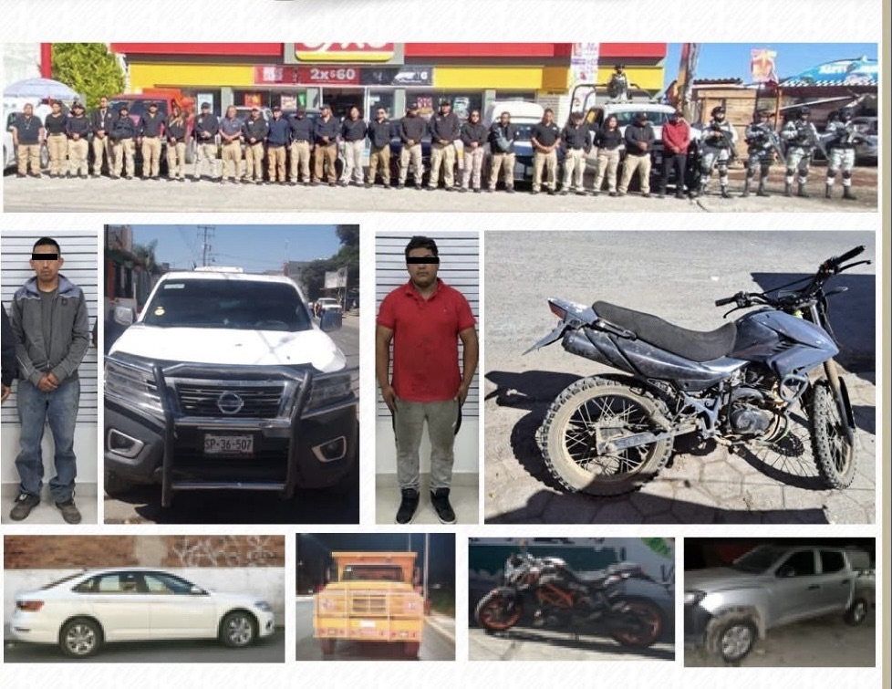 En coordinación con la Guardia Nacional y personal de la Oficina Coordinadora de Riesgos Asegurados (OCRA), las autoridades lograron la detención de dos hombres y el aseguramiento de seis unidades vehiculares con reportes de robo y alteraciones en sus medios de identificación.