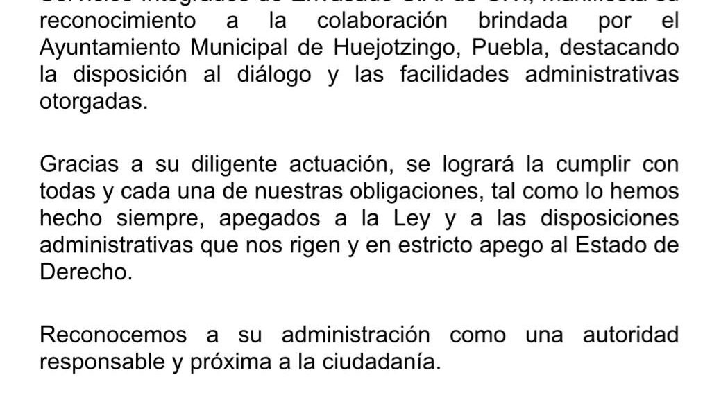 El Gobierno Municipal de Huejotzingo, encabezado por el Presidente Municipal Roberto Solís Valles, informa que la empresa con razón social Servicios Integrados de Envasado S.A. de C.V. (SIESA) ha mostrado plena disposición para colaborar y cumplir con los requerimientos legales y administrativos que le permitan regularizar su situación.