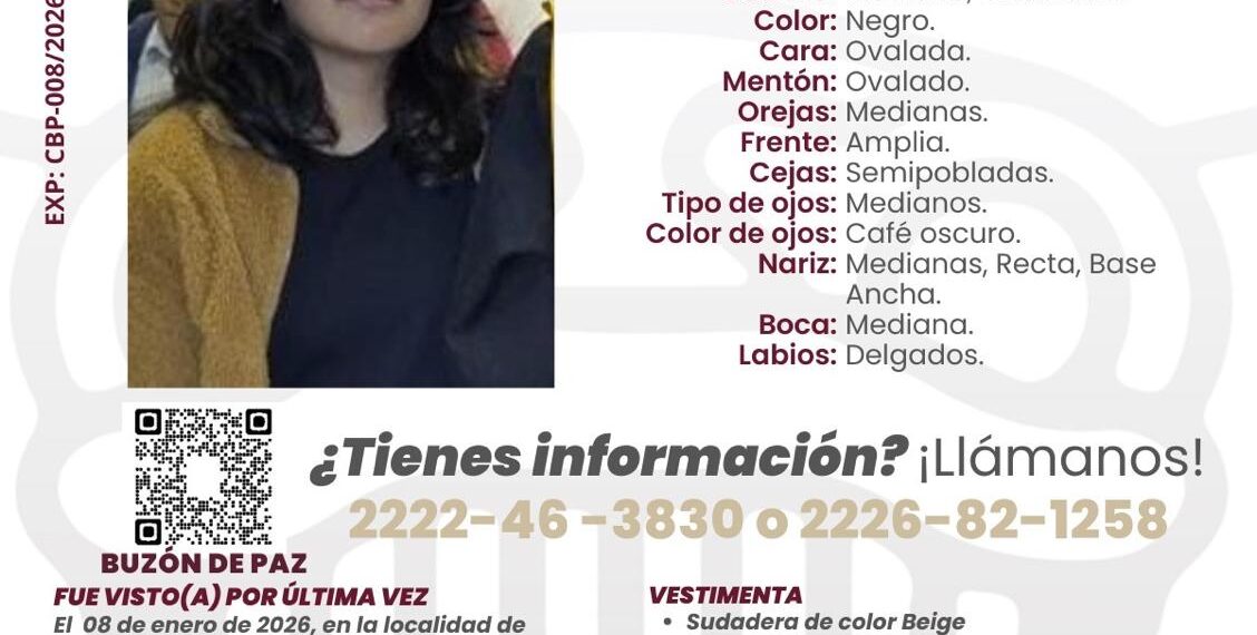 CIUDAD DE PUEBLA, Pue.- Con motivo de la no localización de Andrea Domínguez Coyotl, se aperturó expediente de búsqueda el 10 de enero, a las 22:30 horas, conforme a los protocolos establecidos, informó la Comisión de Búsqueda de Personas del Estado de Puebla.