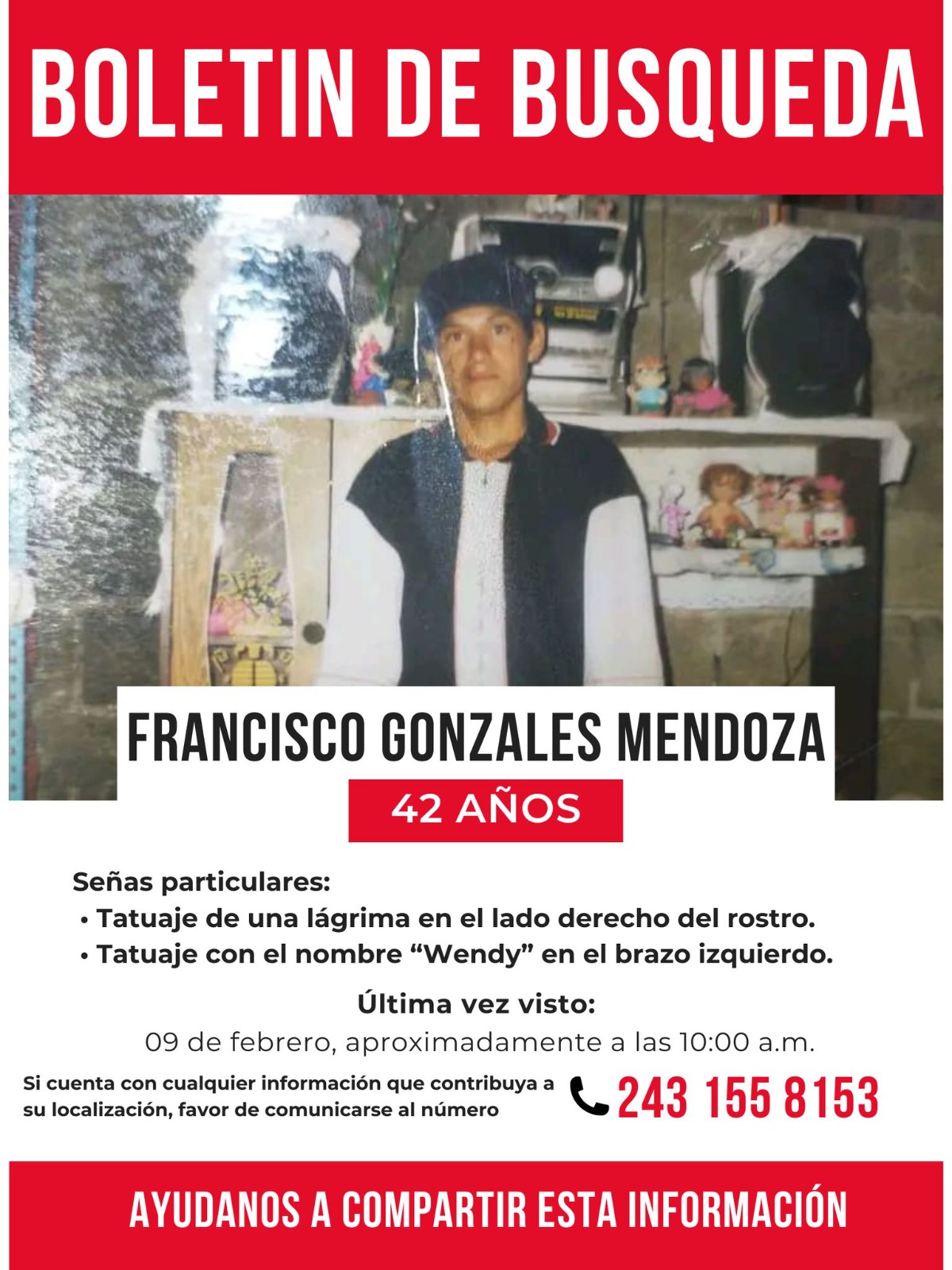 Se trata de Francisco González Mendoza, de 42 años de edad, originario de la comunidad de Atencingo, quien había sido visto por última vez el pasado lunes 9 de febrero tras salir de su domicilio ubicado en la calle Primero de Mayo y no regresar.