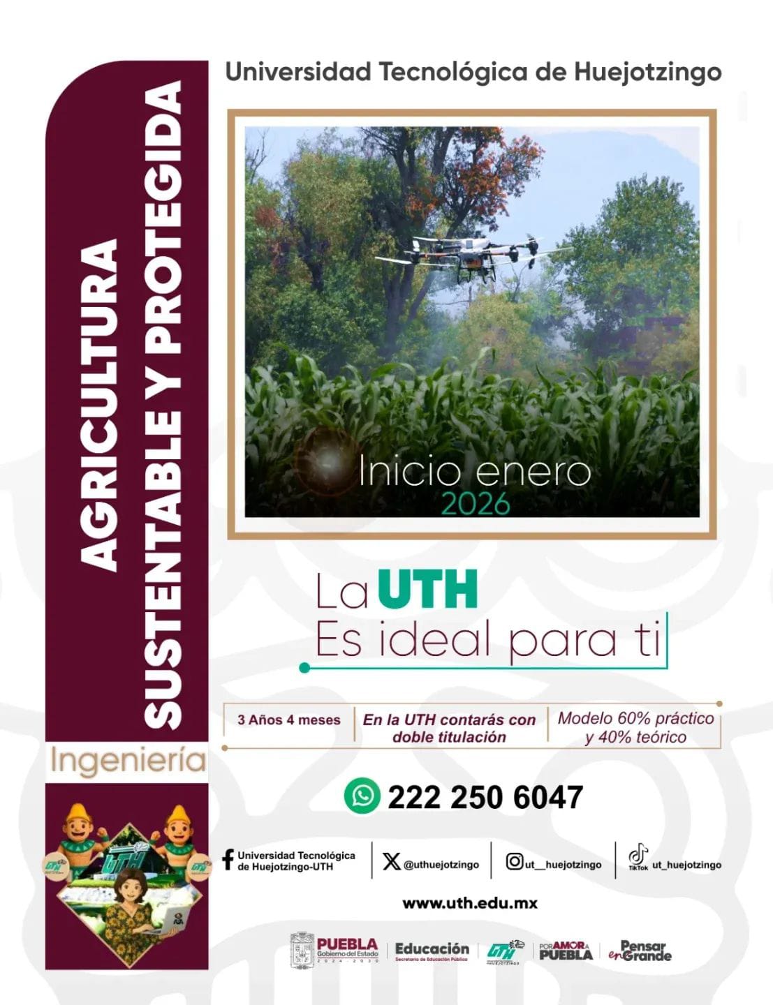 HUEJOTZINGO, Pue.– La Universidad Tecnológica de Huejotzingo (UTH) diversificará su formación profesional a partir del 7 de enero de 2026 con la incorporación de la Licenciatura en Ingeniería en Agricultura Sustentable y Protegida, un programa avalado por todas las autoridades educativas correspondientes.