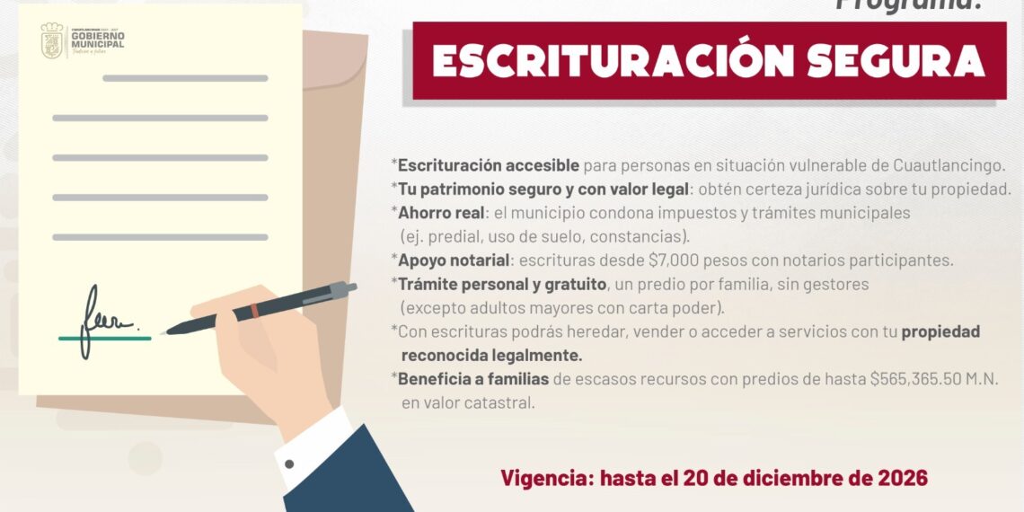 Con el objetivo de brindar certeza jurídica al patrimonio de las familias, el Gobierno municipal de Cuautlancingo, a través de la Sindicatura Municipal, mantiene vigente el programa “Escrituración Segura”, dirigido a ciudadanos de escasos recursos que requieran regularizar la situación legal de sus bienes inmuebles.