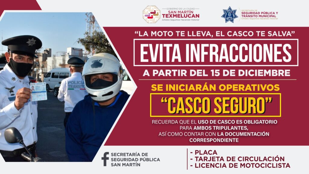 SAN MARTÍN TEXMELUCAN, PUE. – La SSP de San Martín Texmelucan iniciará operativo «Casco Seguro» en la cabecera municipal y sus once juntas auxiliares, esto con el fin de salvaguardar la integridad de las personas, así como detectar motos con reporte de robo.