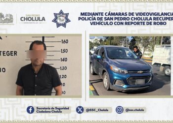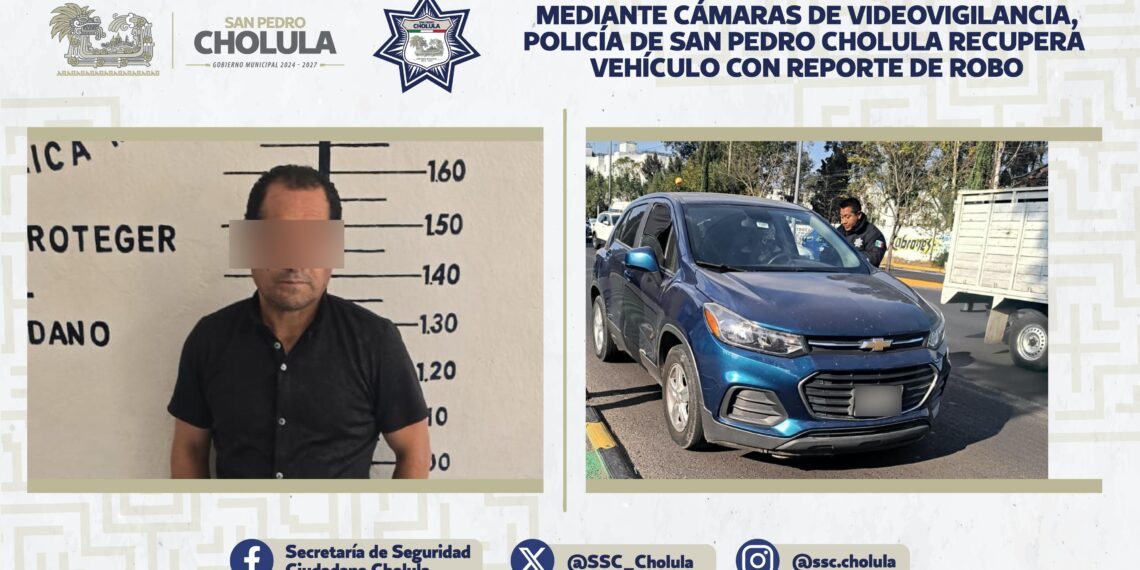 Derivado de las acciones coordinadas entre el Gobierno del Estado de Puebla y la Secretaría de Seguridad Ciudadana de San Pedro Cholula (SSC Cholula), fue detenido José Raúl “N”, de 40 años de edad, quien conducía un vehículo con reporte de robo vigente.