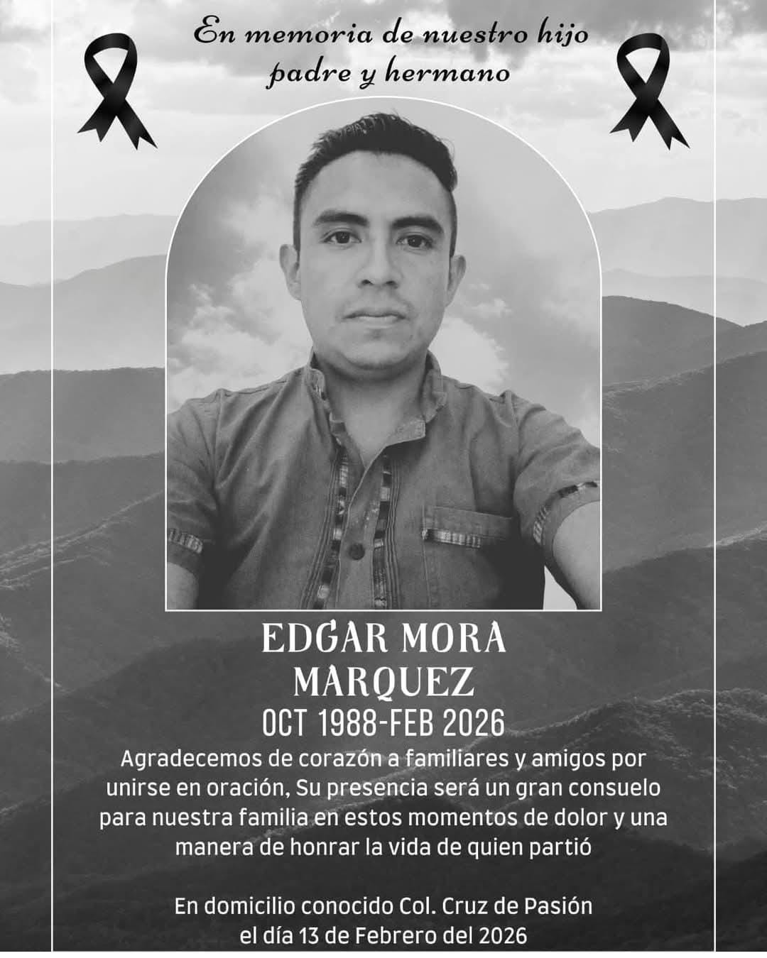 La víctima fue identificada como Edgar Mora Márquez, de 37 años, cuyo fallecimiento generó consternación entre familiares, amigos y habitantes de la comunidad.