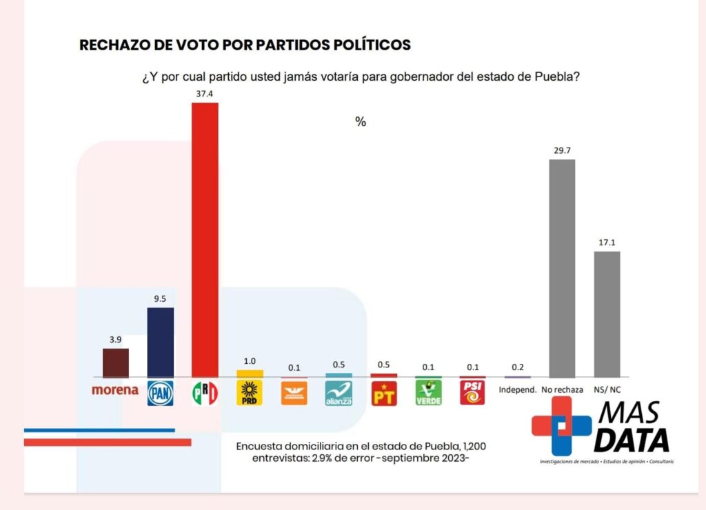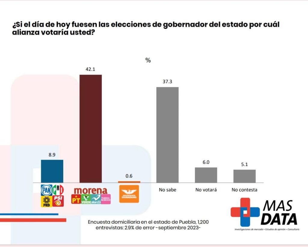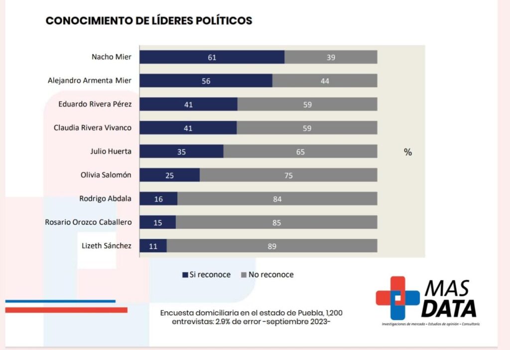 Según los datos arrojados por la empresa, Nacho Mier está por arriba de los demás aspirantes en potencial de voto con un 22%, seguido de Alejandro Armenta con 18%. Hay una clara ventaja sobre Eduardo Rivera con 9%, Claudia Rivera con 6%, Julio Huerta y Olivia Salomón con 4%, Rosario Orozco 2% y Lizet Sánchez y Rodrigo Abdala que sólo alcanzan 1%.