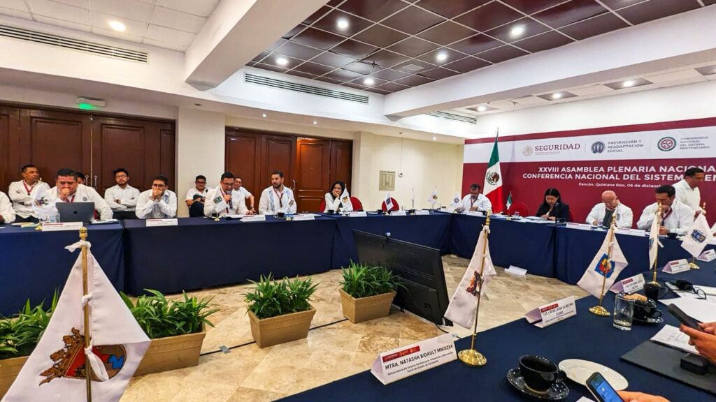 CANCÚN, Q. ROO.- Con el objetivo de intercambiar buenas prácticas, implementar mejores políticas públicas y generar más sinergias, el gobierno presente de Sergio Salomón, a través de la Secretaría de Seguridad Pública, participó en la XXVIII Asamblea Plenaria de la Conferencia Nacional del Sistema Penitenciario.