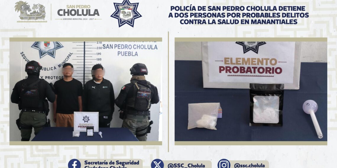 Como resultado de los recorridos permanentes de vigilancia y la atención oportuna a conductas constitutivas de delito, la Secretaría de Seguridad Ciudadana de San Pedro Cholula (SSC Cholula) informó la detención de Isaac “N”, de 25 años de edad, y José Armando “N”, de 21 años, por su probable responsabilidad en delitos contra la salud, en la junta auxiliar Rafael Ávila Camacho (Manantiales).