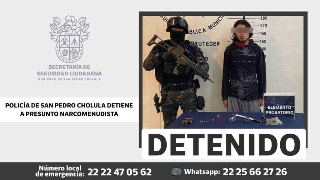 San Pedro Cholula, Pue .- Elementos de la Secretaría de Seguridad Ciudadana de San Pedro Cholula (SSC Cholula), llevaron a cabo el aseguramiento de Braulio “N”, de 21 años de edad, en la Junta Auxiliar de San Matías Cocoyotla, por presuntos delitos contra la salud y portación de objeto prohibido.