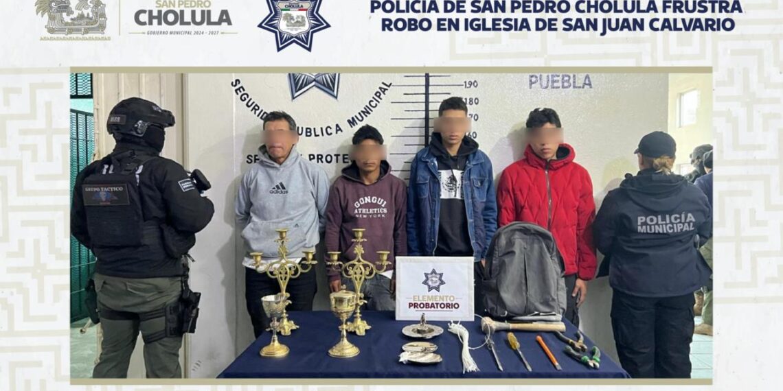 Como resultado de la pronta y efectiva respuesta de elementos de la Secretaría de Seguridad Ciudadana de San Pedro Cholula (SSC Cholula), se logró frustrar el robo de piezas de arte sacro en la iglesia de San Juan Calvario, ubicada en el barrio del mismo nombre, además de la detención de cuatro probables responsables.