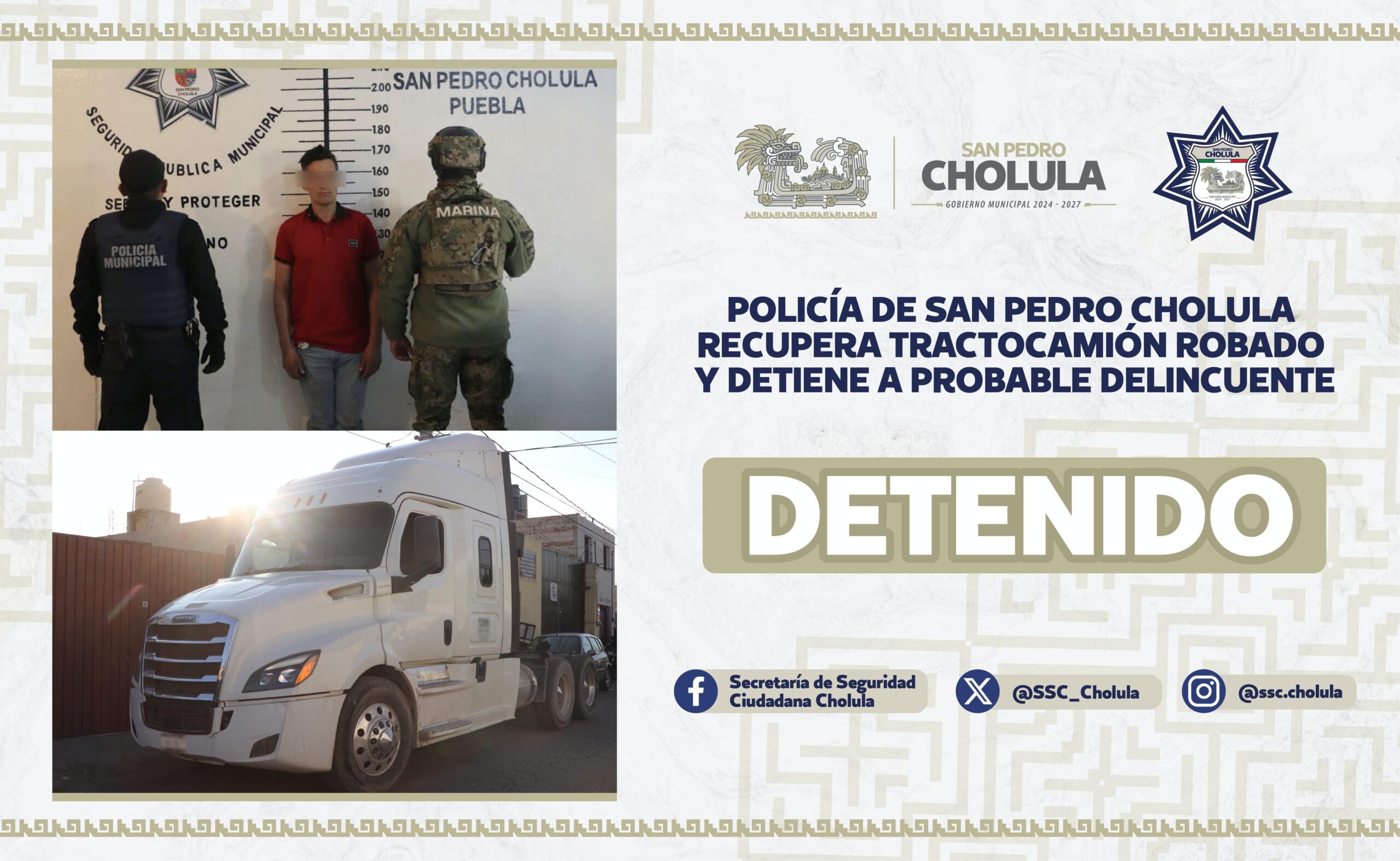 10 de febrero, 2025. San Pedro Cholula, Pue.- Como resultado de una respuesta inmediata, elementos de la Secretaría de Seguridad Ciudadana de San Pedro Cholula (SSC Cholula) detuvieron a Antonio de Jesús “N” de 40 años de edad, por su probable participación en el robo de un tractocamión.