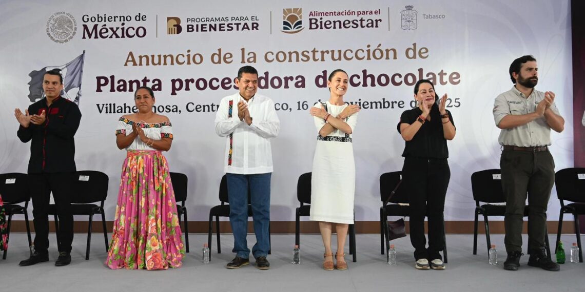 *Villahermosa, Tabasco, a 16 de noviembre de 2025.-* En Villahermosa, Tabasco, la Presidenta Claudia Sheinbaum Pardo, anunció la construcción de la primera Planta procesadora de Chocolate Bienestar, que tendrá una inversión inicial de 80 millones de pesos (mdp) y permitirá consolidar a la entidad como la productora del mejor chocolate del mundo.