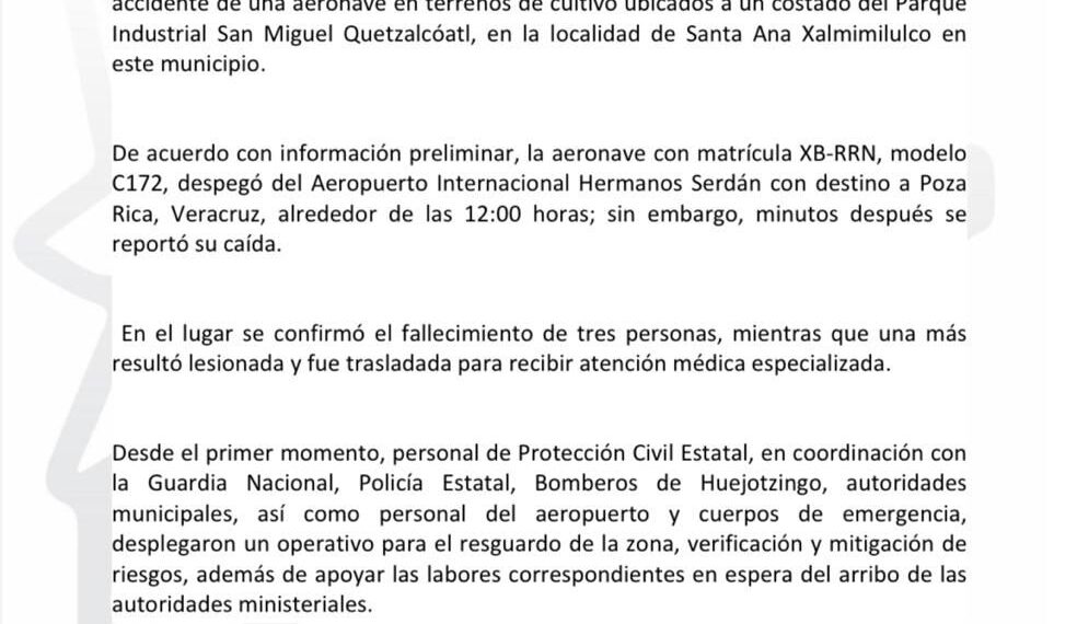 De acuerdo con información preliminar, la aeronave con matrícula XB-RRN, modelo C172, despegó del Aeropuerto Internacional Hermanos Serdán con destino a Poza Rica, Veracruz, alrededor de las 12:00 horas; sin embargo, minutos después se reportó su caída.