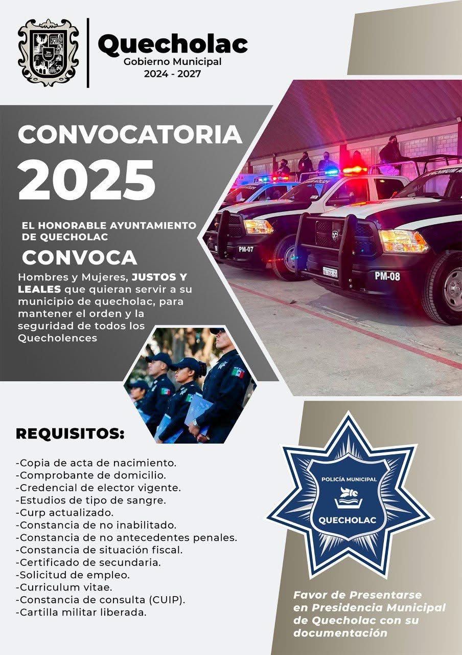 “Convocamos a personas con compromiso, disciplina y amor por su municipio. Esta es una oportunidad de servir con honor y contribuir a la construcción de un Quecholac más seguro”, expresó la administración municipal.