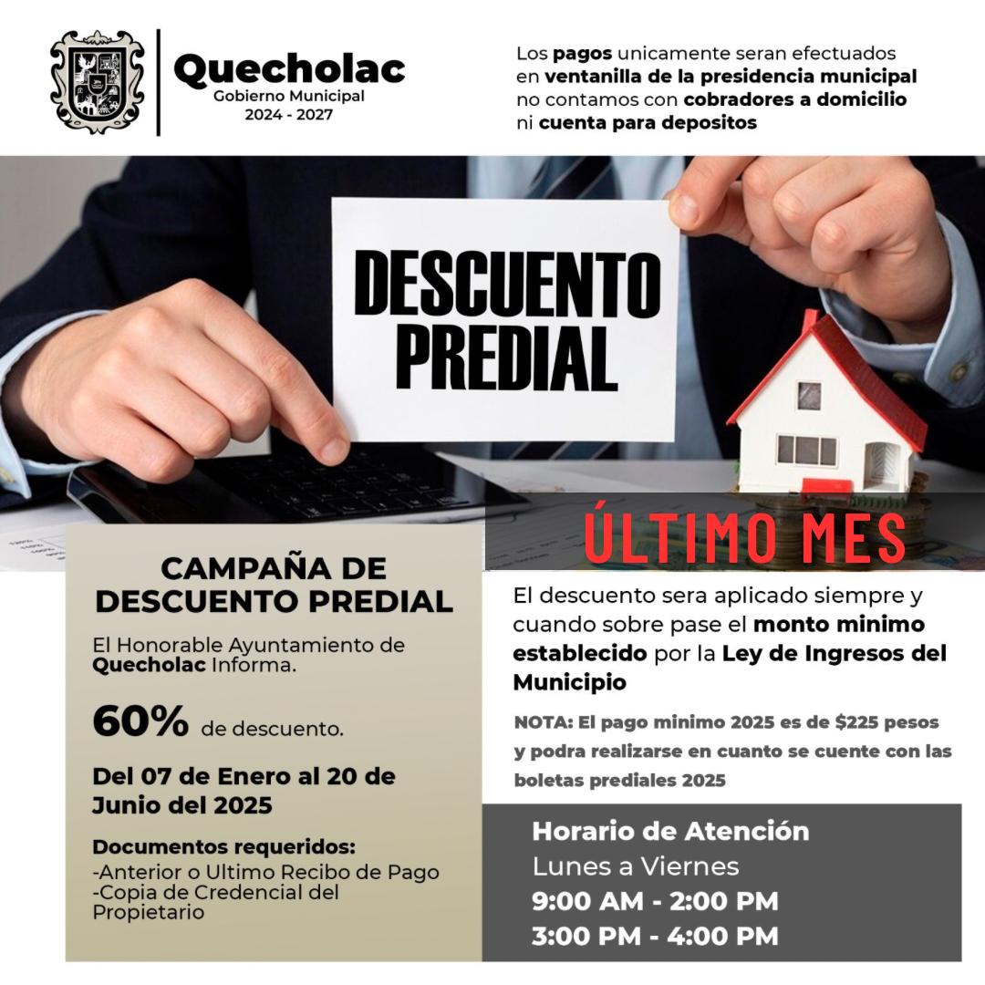 Quecholac, Puebla — El Honorable Ayuntamiento de Quecholac, encabezado por la Presidenta Municipal María Guadalupe Martínez Gerardo, invita a la ciudadanía a aprovechar el último mes de descuentos en el pago del impuesto predial, vigente hasta el próximo 20 de junio de 2025.