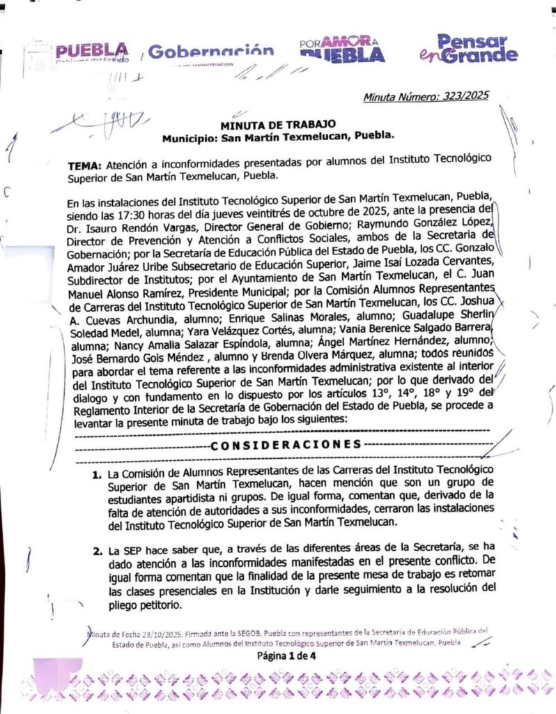 Con la firma de la minuta y la entrega formal de las instalaciones, la SEP y la SEGOB informaron que el Tecnológico de San Martín Texmelucan retoma este lunes sus actividades académicas de manera presencial, tras casi un mes de suspensión. El subsecretario Gonzalo Amador Juárez señaló que el gobierno estatal mantendrá comunicación constante con la comunidad educativa para garantizar el cumplimiento de los acuerdos y la estabilidad dentro del plantel.
