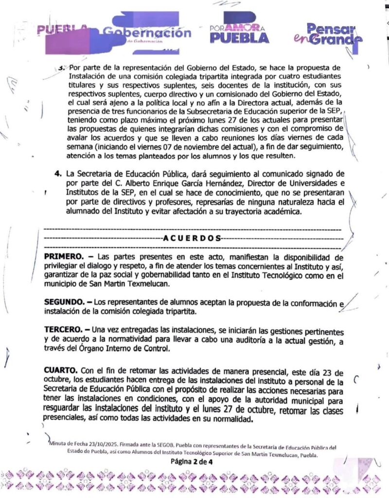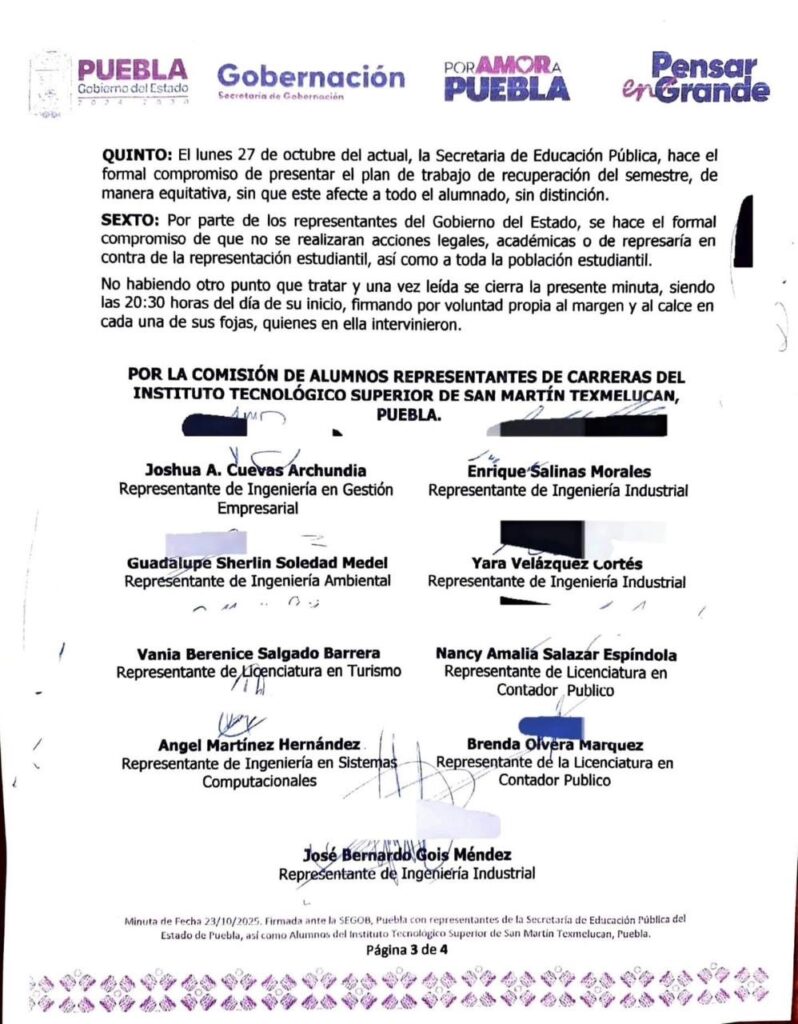 La SEP se comprometió a elaborar un plan de trabajo para la recuperación del semestre, el cual deberá aplicarse de manera equitativa para todo el alumnado, evitando que se afecte su trayectoria académica. Asimismo, se acordó iniciar las gestiones necesarias para llevar a cabo una auditoría a la actual administración del Instituto Tecnológico Superior de San Martín Texmelucan, a través del Órgano Interno de Control, con el propósito de transparentar el manejo de los recursos y la gestión institucional.