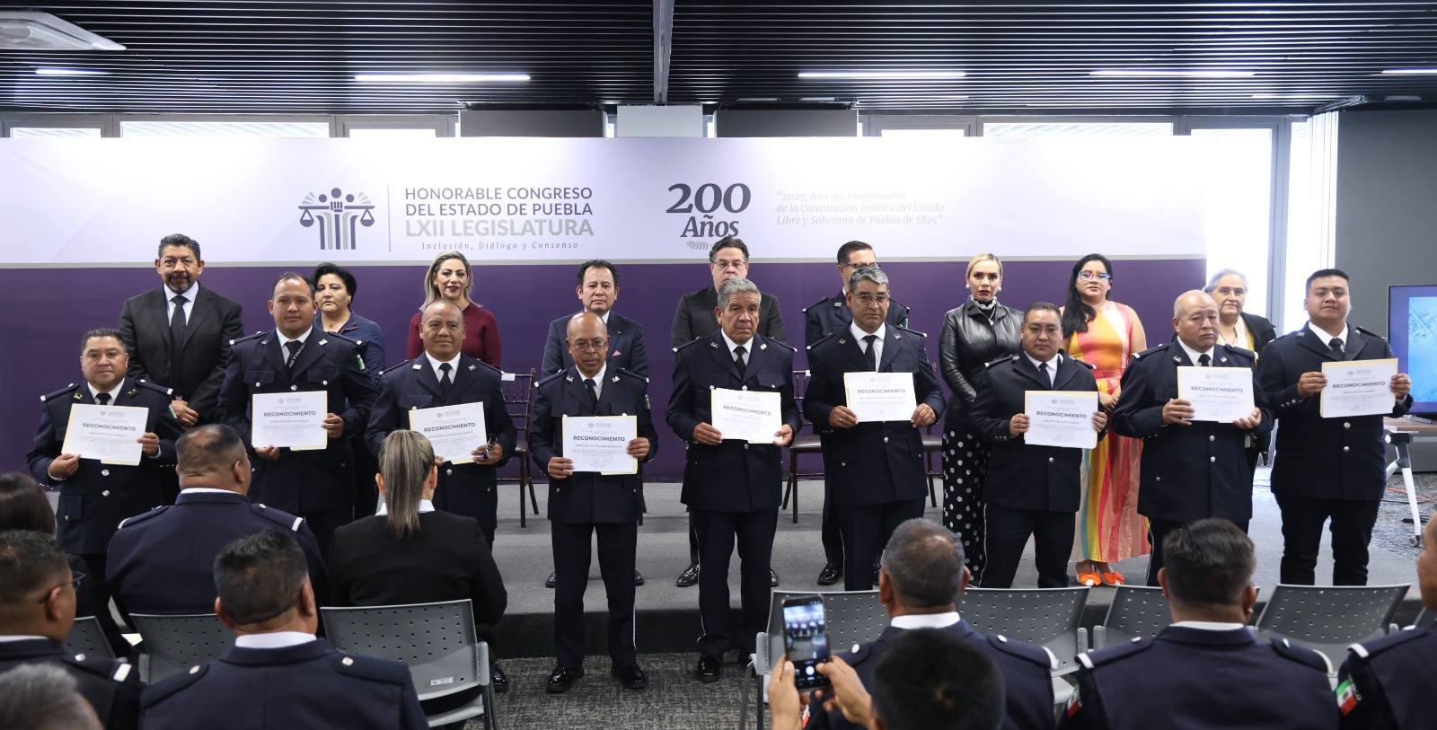 El Congreso del Estado, a través del Voluntariado, entregó reconocimientos a integrantes de la Banda Sinfónica de la Secretaría de Seguridad Pública por los 36 años de trayectoria de la agrupación, con la finalidad de destacar su contribución a la promoción de la cultura y el fortalecimiento del tejido social.