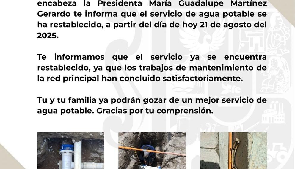 Quecholac, Pue. – El Honorable Ayuntamiento de Quecholac, encabezado por la presidenta municipal María Guadalupe Martínez Gerardo, informó que el servicio de agua potable en el municipio quedó restablecido luego de concluir con éxito los trabajos de reparación en la red principal.