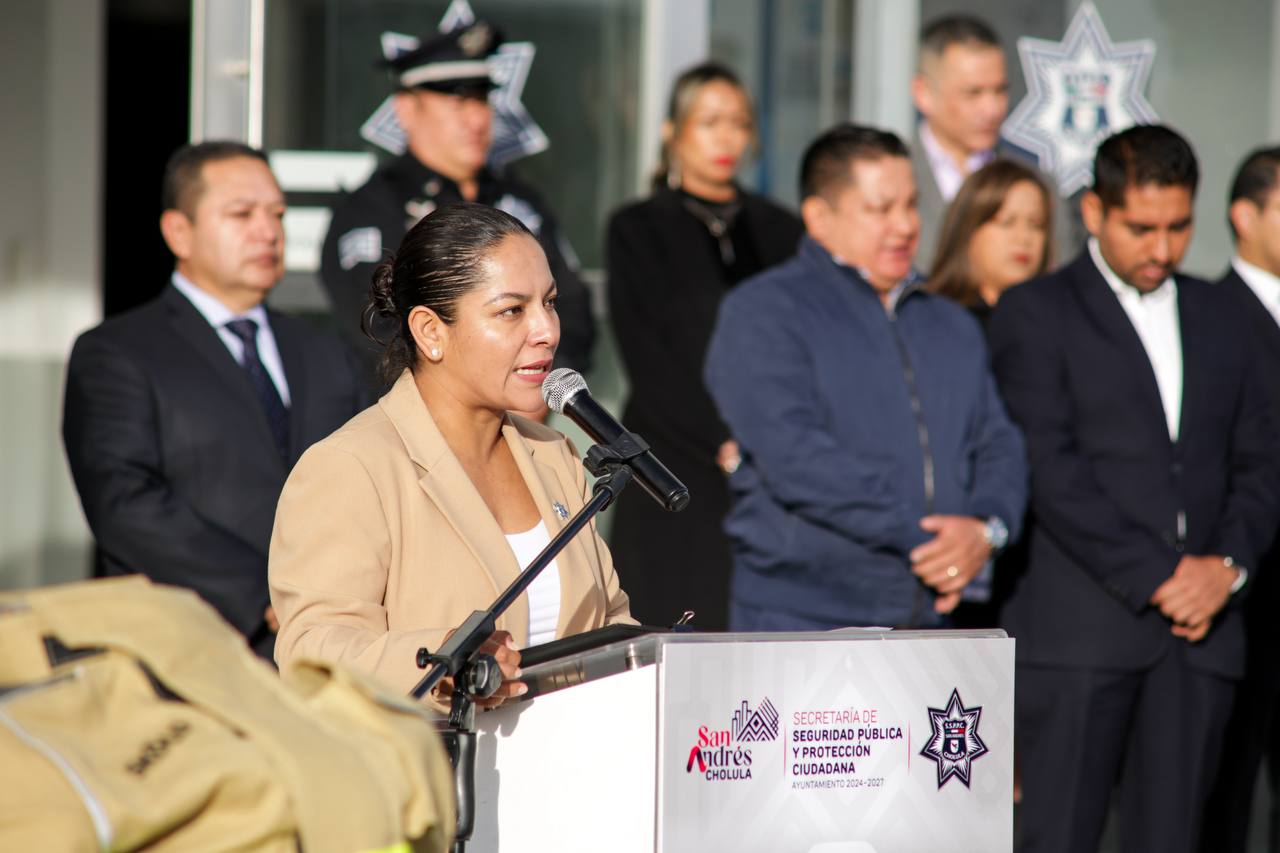 San Andrés Cholula, Puebla.- Con el objetivo de fortalecer la seguridad pública mediante acciones estratégicas desde una perspectiva integral, la presidenta municipal Lupita Cuautle Torres, realizó la entrega de 150 dispositivos electrónicos de seguridad para elementos policiales, 12 trajes estructurales para bomberos y una ambulancia totalmente equipada.