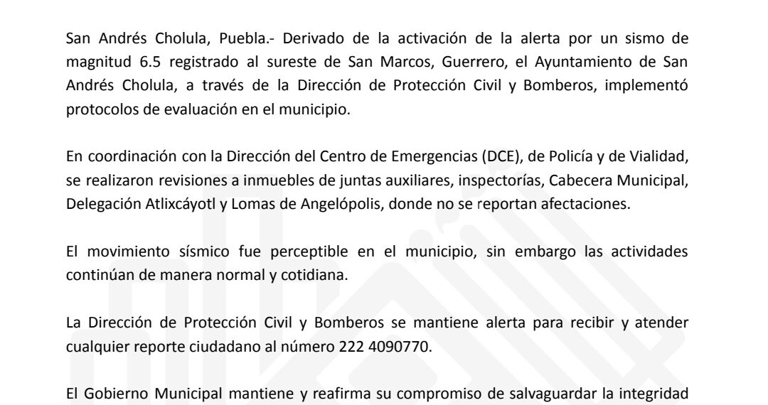 San Andrés Cholula, Puebla.– Derivado de la activación de la alerta sísmica por un sismo de magnitud 6.5 registrado al sureste de San Marcos, Guerrero, el Ayuntamiento de San Andrés Cholula informó saldo blanco en el municipio.