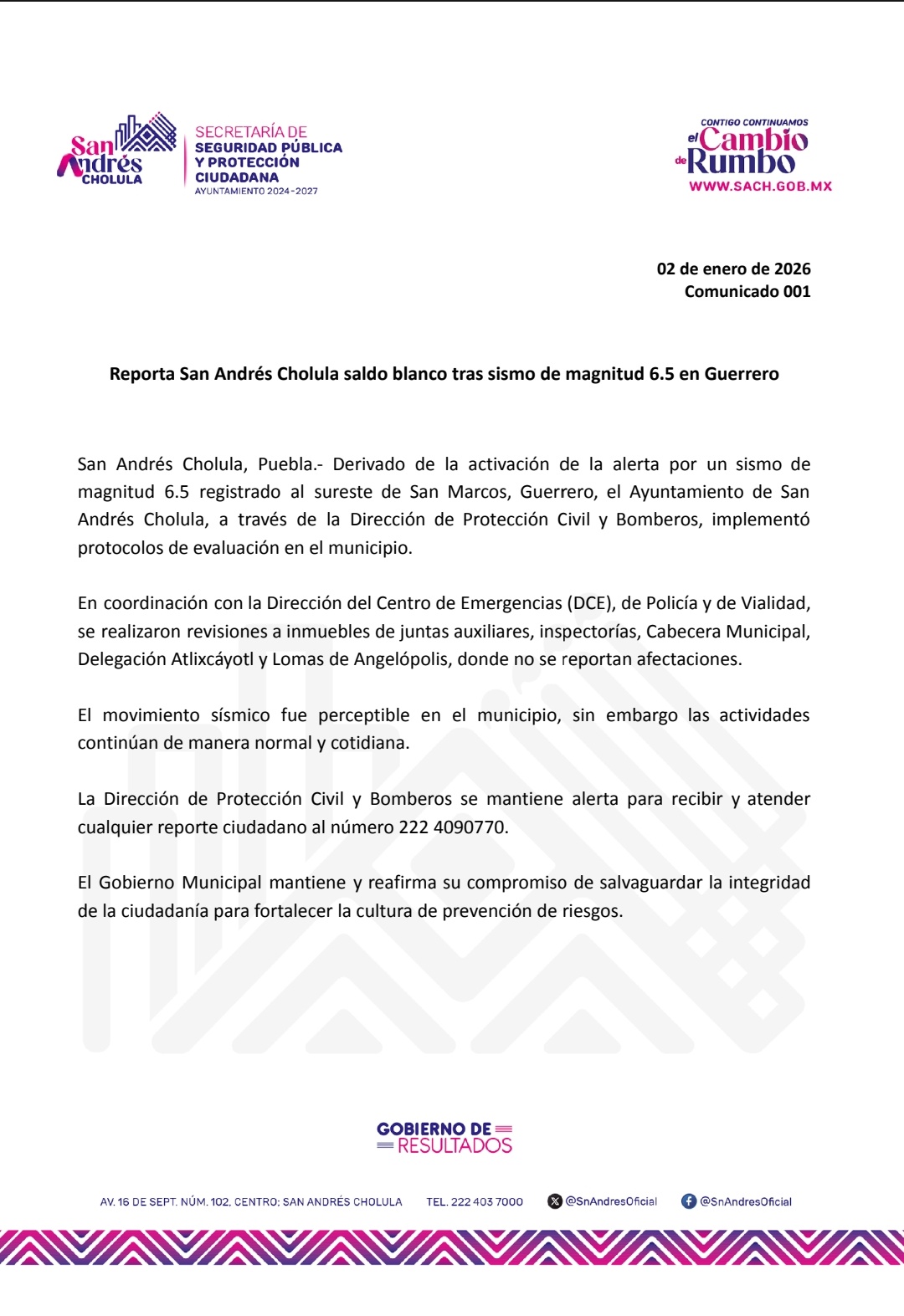 San Andrés Cholula, Puebla.– Derivado de la activación de la alerta sísmica por un sismo de magnitud 6.5 registrado al sureste de San Marcos, Guerrero, el Ayuntamiento de San Andrés Cholula informó saldo blanco en el municipio.