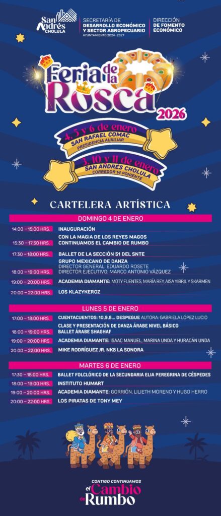 Esta tradicional celebración se realizará del 4 al 6 de enero en la explanada de la presidencia auxiliar de San Rafael Comac, en un horario de 09:00 a 22:00 horas, donde se instalará un corredor gastronómico acompañado de actividades recreativas y culturales para toda la familia. De manera complementaria, se habilitarán puntos de venta los días 3, 10 y 11 en el corredor de la 14 Poniente, ubicado en la Cabecera Municipal de San Andrés Cholula.