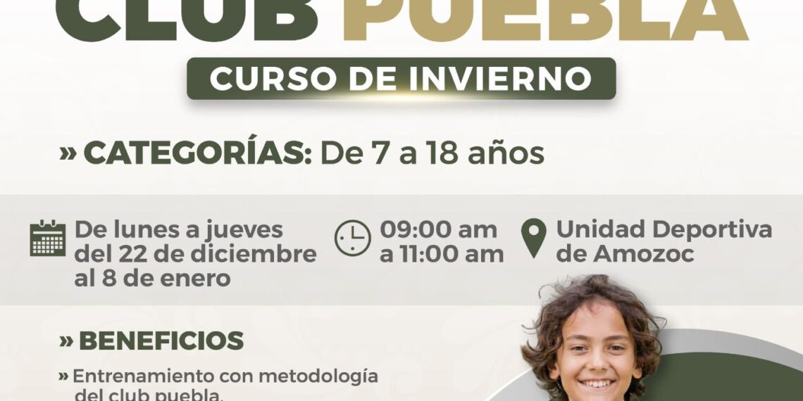 En coordinación con el Gobierno del Estado de Puebla, encabezado por el Gobernador Alejandro Armenta, la Universidad del Deporte y el Club Puebla, se invita a niñas, niños y jóvenes de 7 a 18 años a participar en los Talleres de Fútbol Club Puebla – Curso de Invierno, los cuales se llevarán a cabo en el municipio de Amozoc.