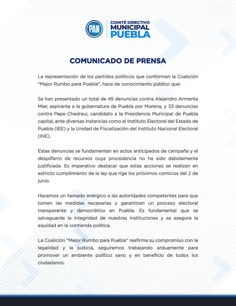 Hacemos un llamado enérgico a las autoridades competentes para que tomen las medidas necesarias y garanticen un proceso electoral transparente y democrático en Puebla. Es fundamental que se salvaguarde la integridad de nuestras instituciones y se asegure la equidad en la contienda política.