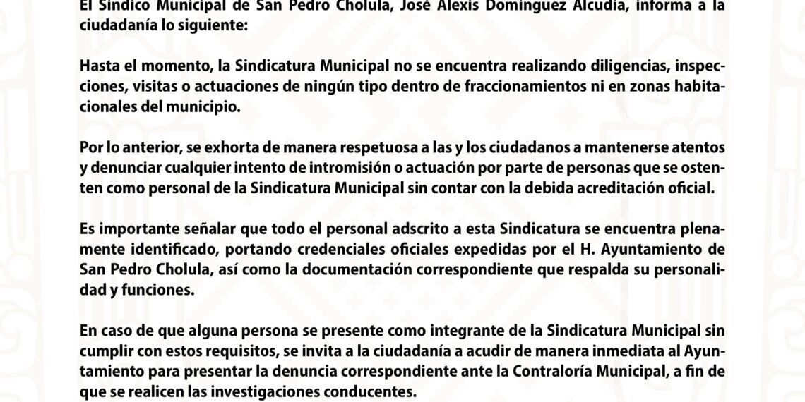 El Síndico Municipal de San Pedro Cholula, José Alexis Domínguez Alcudia, informa a la ciudadanía lo siguiente: