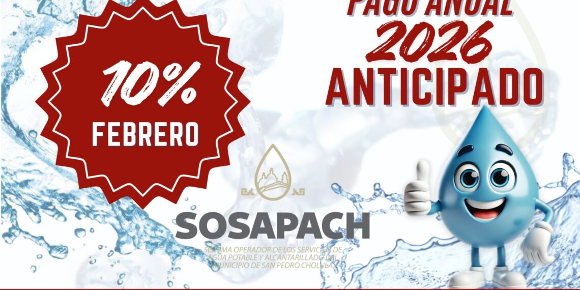 El Sistema Operador de los Servicios de Agua Potable y Alcantarillado del Municipio de San Pedro Cholula (SOSAPACH) informa a la ciudadanía que continúa vigente el programa de Pago Anual Anticipado 2026, el cual ofrece beneficios directos a la economía de las familias cholultecas.